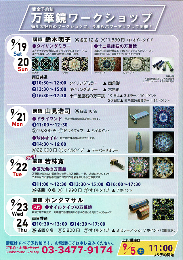 3. 十二星座石の万華鏡 16:30〜18:00(終了時間が変更になりました。) 19日:3ミラー 10ポイント 20日:直角三角形ミラー 12ポイント お好みで自分の星座石をセレクトできる人気シリーズ。 繊細で美しい万華鏡をお作りいただけます。 |